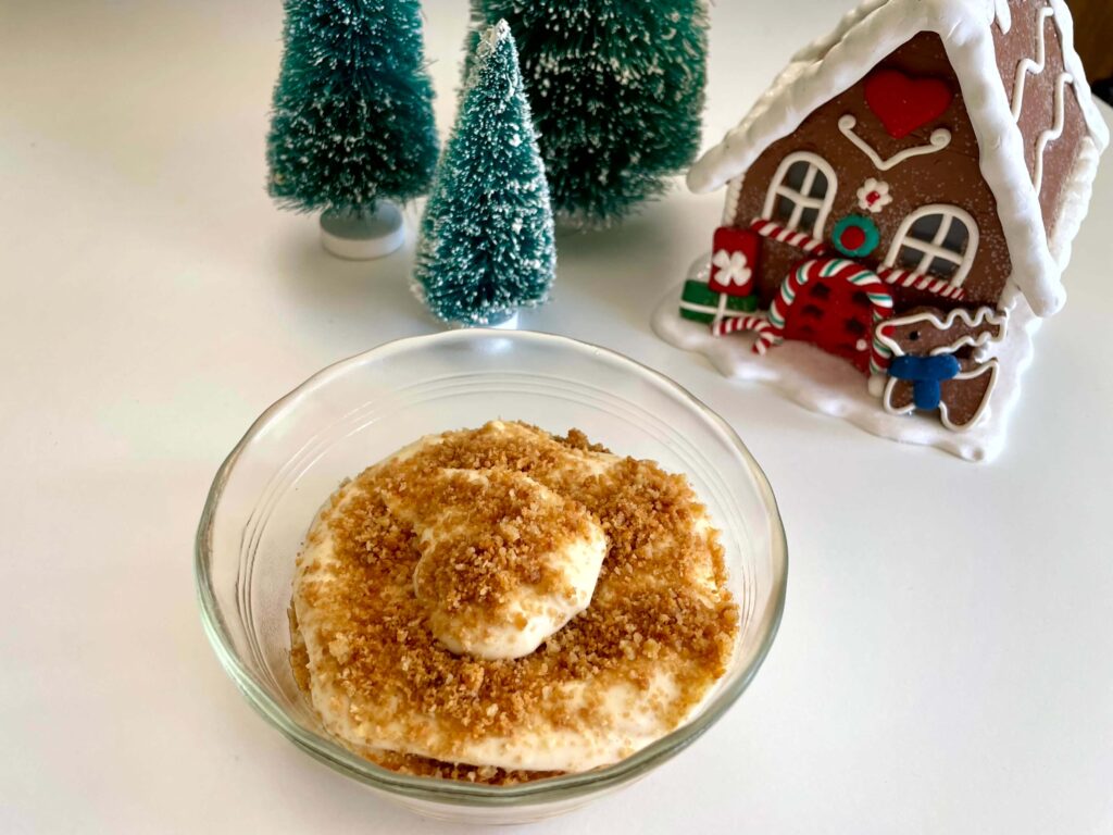 Eggnog cheesecake parfait with Christmas decorations in the background